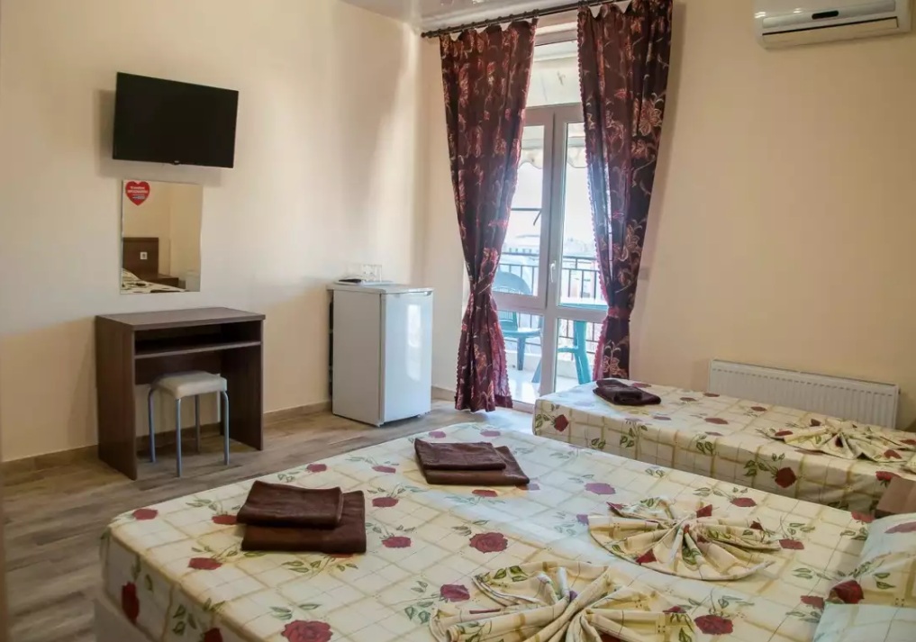 Уютный номер с современной отделкой. В номере двуспальная и две односпальные кровати Springbox (можно сдвигать), шкаф, прикроватные тумбочки, столик и стулья.